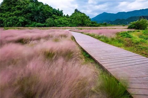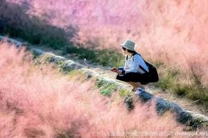 步入景区门口,入眼便是成片的紫色梦幻柳叶马鞭草花海,轻柔的微风吹过,掀起层层叠叠的紫色波浪,美轮美奂!无需语言,只需站在花海里,便收获快乐和开心,无论是老朋友、大朋友还是小朋友,在花丛中拍照,每一张相片都是杰作。赏唯美【粉黛乱子草】每年都会在9月到11月,这一金秋时节盛放。它开花时粉紫色花穗如发丝从基部长出,曼妙轻盈,如梦似幻,花穗云雾状,呈现出一片粉色花海。在峰林的映衬和秋风的吹拂下,粉红花穗,轻微摇摆,如烟似霞,如云似雾,仿佛进入了爱丽丝仙境,动人心魄。欠下的少女心,这里一次性还给你,给你一场浪漫的“秋天的童话”!