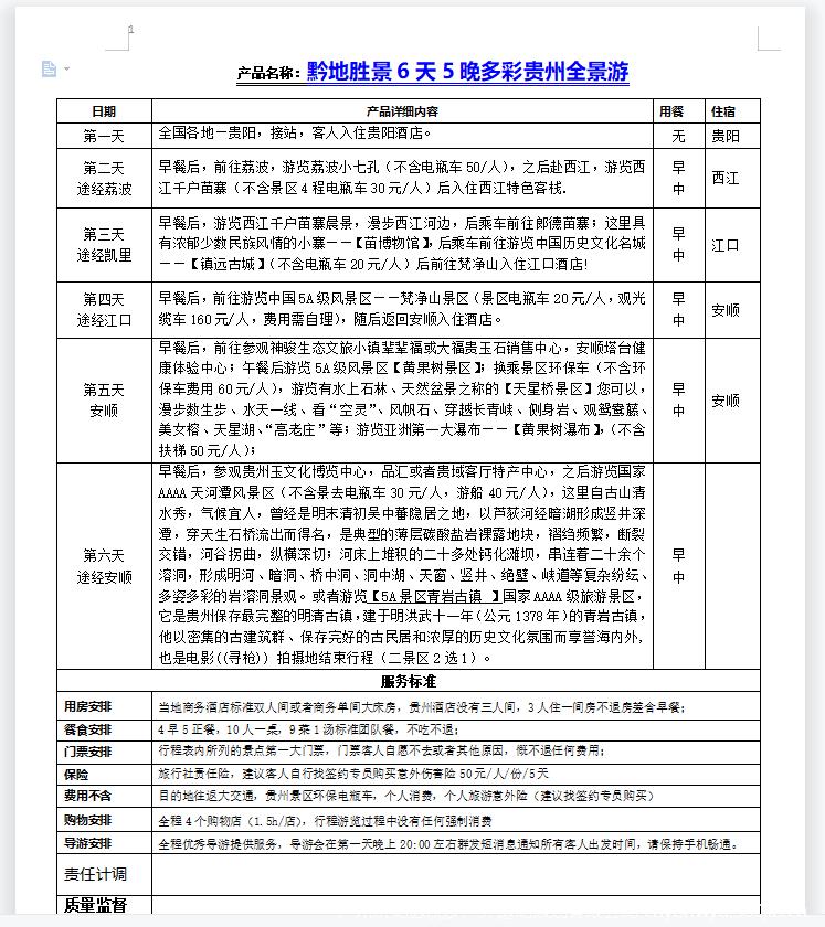 6天景区交通费自理:黄果树110+小七孔50+西江30+梵净山170+镇远20+青岩20=400/人