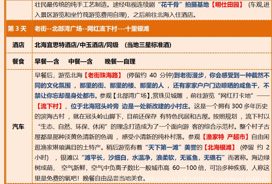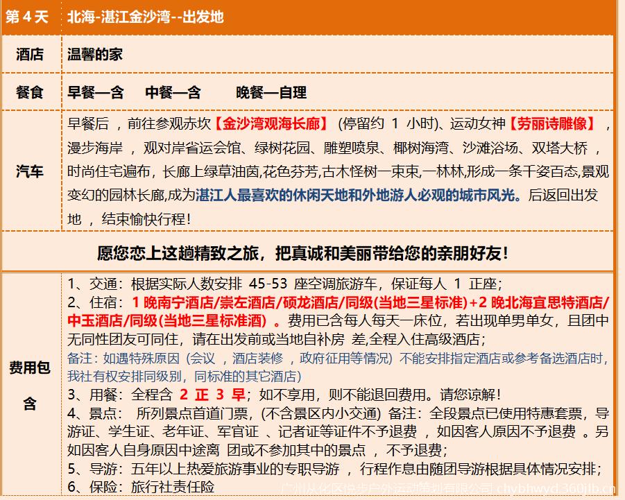 注意事项 | 1.我社按客人报名先后顺序排位,预先给客人编排好车位,请客人自觉礼让,听从导游安排! 2.游客于出发当天必须带本人身份证原件, 以便入住酒店登记,否则后果自负!2010 年 7月开始,酒店不再提供一次性用 品 (拖鞋、牙刷、牙膏、香皂、沐浴液) 等,请客人出团前准备好。建议客人购买团队旅游意外保险。 4.此线路车程较长,团友应视自身的情况,适当带些药物及食品, 以便不时之需。建议客人购买团队旅游意外保险。(如遇赠送的景点客人自愿放弃不予退还景点费用) 5.本行程为参考旅游行程,旅行社有权根据实际情况,对行程游览先后顺序和住宿做出调整,但不影响原定标准和游览景点, 最终游览行程以出发当天导游公布的为准,不作提前通知。 6.由于沙滩海岛活动多为自由活动,所以导游不能陪同,请游客注意人身安全,遇见险情,应立即通知景区工作人员及导游; 沙滩、海岛线的餐饮多数以海鲜为主,若游客有过吃海鲜过敏等现象,请谨慎并自备药品;部分沙滩、海岛自费项目较多 (如 海上降落伞、香蕉船等) ,游客应根据个人身体状况自愿参加,游玩时请注意安全;遇上台风或浪大时,请听从海监部门、 景区工作人员、导游的指挥,切勿强行上船或下水游玩;沙滩、海岛线路旅行社仅安排游客到沙滩或海边游览,不组织游客 游泳,敬告游客在自由活动时,应在有效安全区域内活动。 |