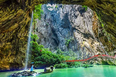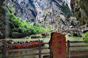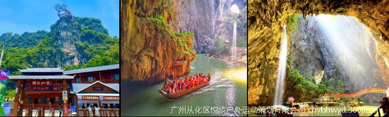 13:00—17:00前往【洞天仙境】(不含景区交通船票,需自理10元/人)国家级AAAA旅游景区,一个心灵栖息的地方,地处闻名遐迩的“南天第一峰林”, 素有“华南第一天坑”之称,是英西峰林走廊的核心景区。以其独特的喀斯特地貌、沟壑险峻的地理特征为依托,融山、水、石、潭、钟乳、瀑布、天桥、天坑、绿洲为一体。泛舟天坑,两岸钟乳林立,石笋如画,晶莹斑斓, 七彩水影天幕,天然白玉观音像,穿越铁索栈道、徒步“穿天悬空栈道”更能突显出大自然的鬼斧神工与人类智慧的相结合,沿河景观达一百余处,各具特色,是一个集“天坑奇观、九龙之星玻璃观景台、玻璃滑道、休闲娱乐、特色美食、野外拓展”的原生态综合型旅游景区。
