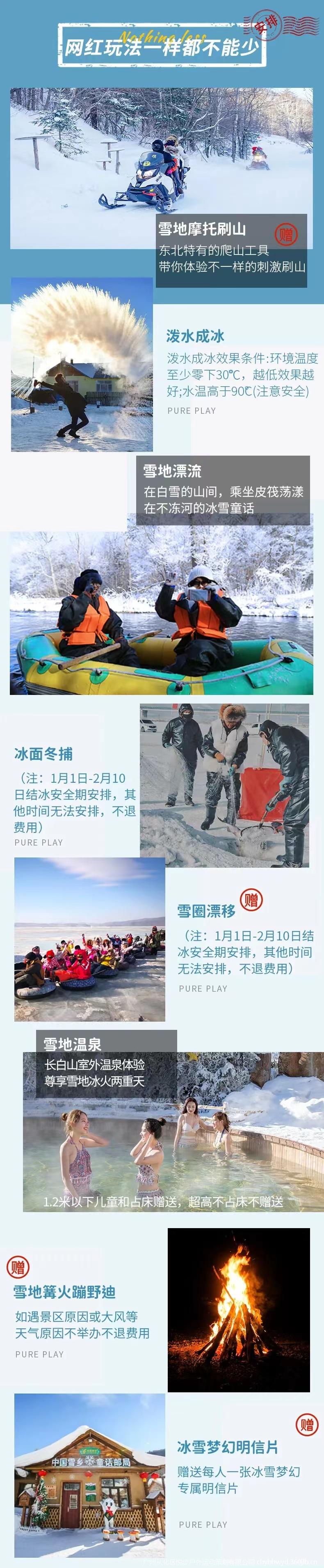 5、赠送冰面雪圈、冰面冬捕(1月1日-2月10日结冰安全期安排,其他时间无法安排,不退费用)。