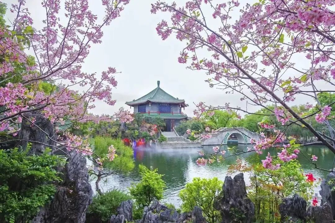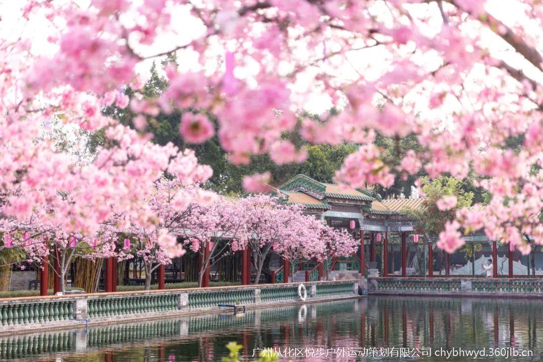 南粤苑的山峦亭榭也满是樱花点缀