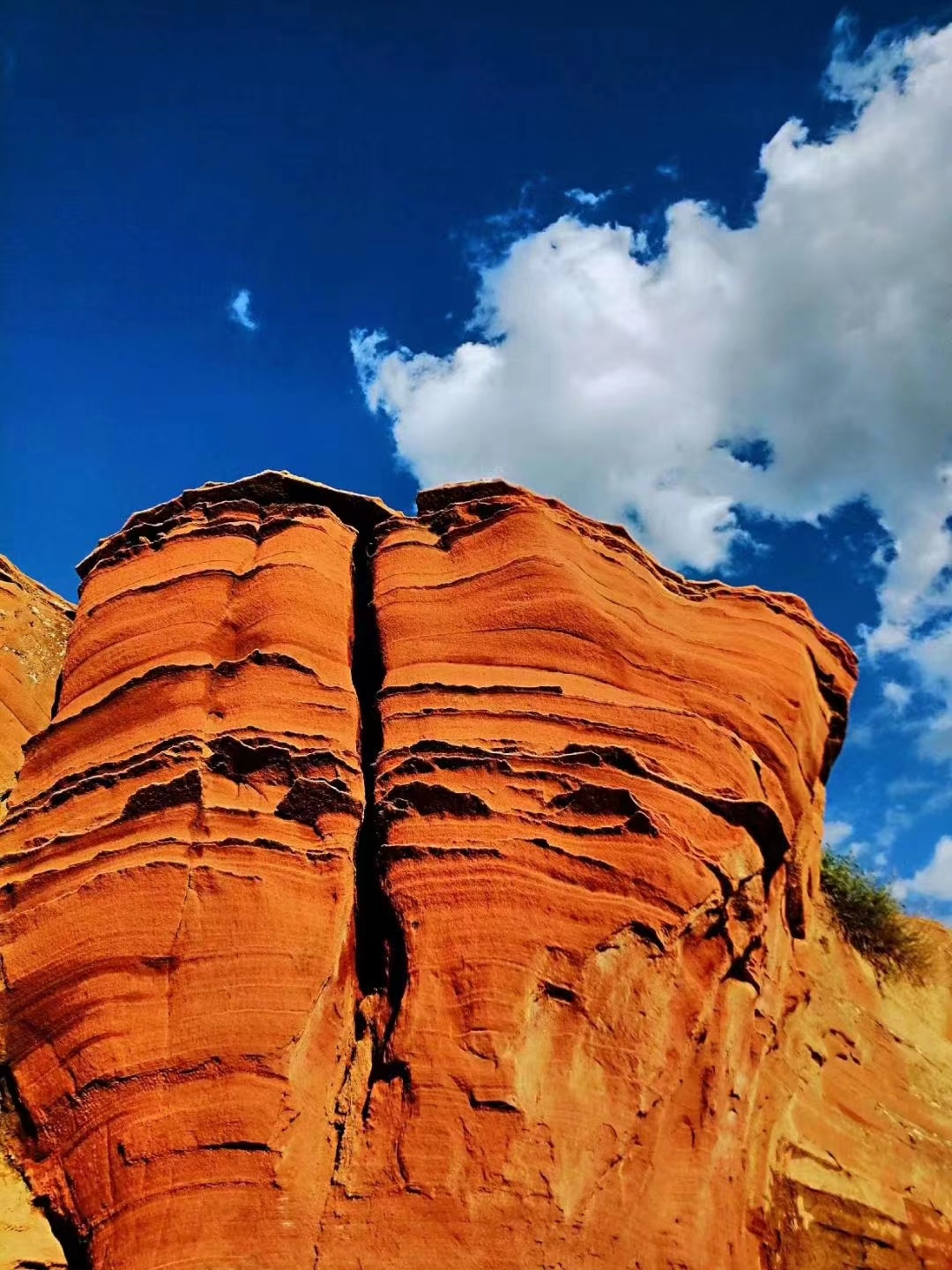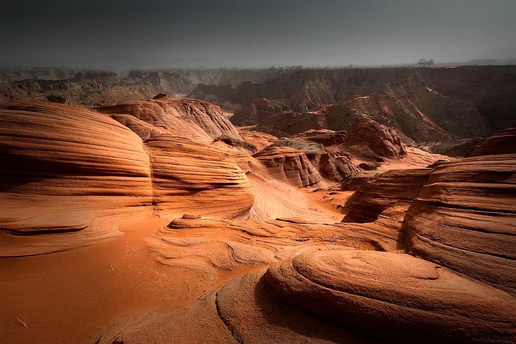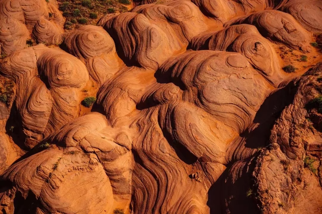 波浪谷看到红色石头像泥石流一样呈现出一种流水状,一圈圈、一坨坨、一弯弯的向沟壑中涌去。这种石头类似一种沙岩,风化脱离很严重。在上面行走,一不留神就会被附在表皮上的红色细沙滑倒。沿着沟边的红色石头一直往下走,在宽阔之处看到很大的且平整的石壁,从上到下均为红色,而且颜色基本一致。在狭窄之处,红色石头呈现出一种流水状,就像红色的泥浆一般纷涌汇聚,向沟底流淌。在闫寨子沟对面的长嘴畔,这里地势相对平缓,那些层层叠叠的石头就像一大批铺盖在地面上浸染过后晾晒的红色布匹,一层层、一卷卷、一盘盘在夕阳的渲染之下,异常的鲜红;又似黄土中冒出的一股红水缓慢地向低洼处流淌。