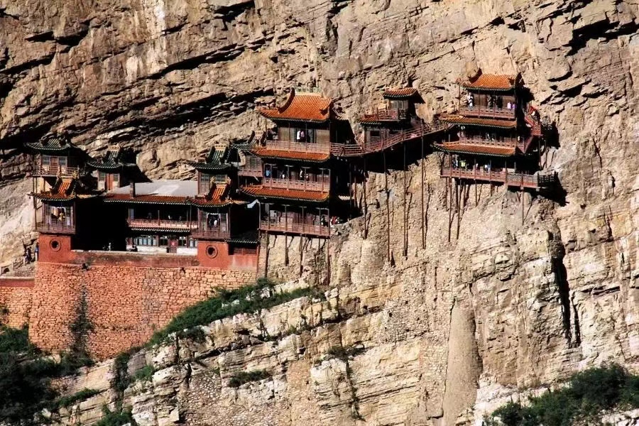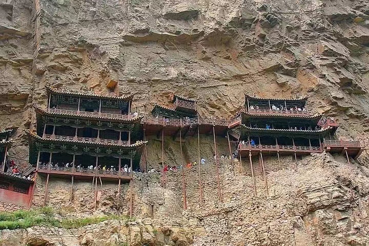 悬空寺,位于山西省大同市浑源县恒山金龙峡西侧翠屏峰峭壁间,原叫“玄空阁”,“玄”取自于中国道教教理,“空”则来源于佛教的教理,后改名为“悬空寺”,是因为整座寺院就像悬挂在悬崖上,在汉语中,“悬”与“玄”同音,因此得名。建成于公元491年,是佛、道、儒三教合一的独特寺庙。“悬空寺”建筑极具特色,以如临深渊的险峻而著称,素有“悬空寺,半天高,三根马尾空中吊”的俚语,以如临深渊的险峻而著称