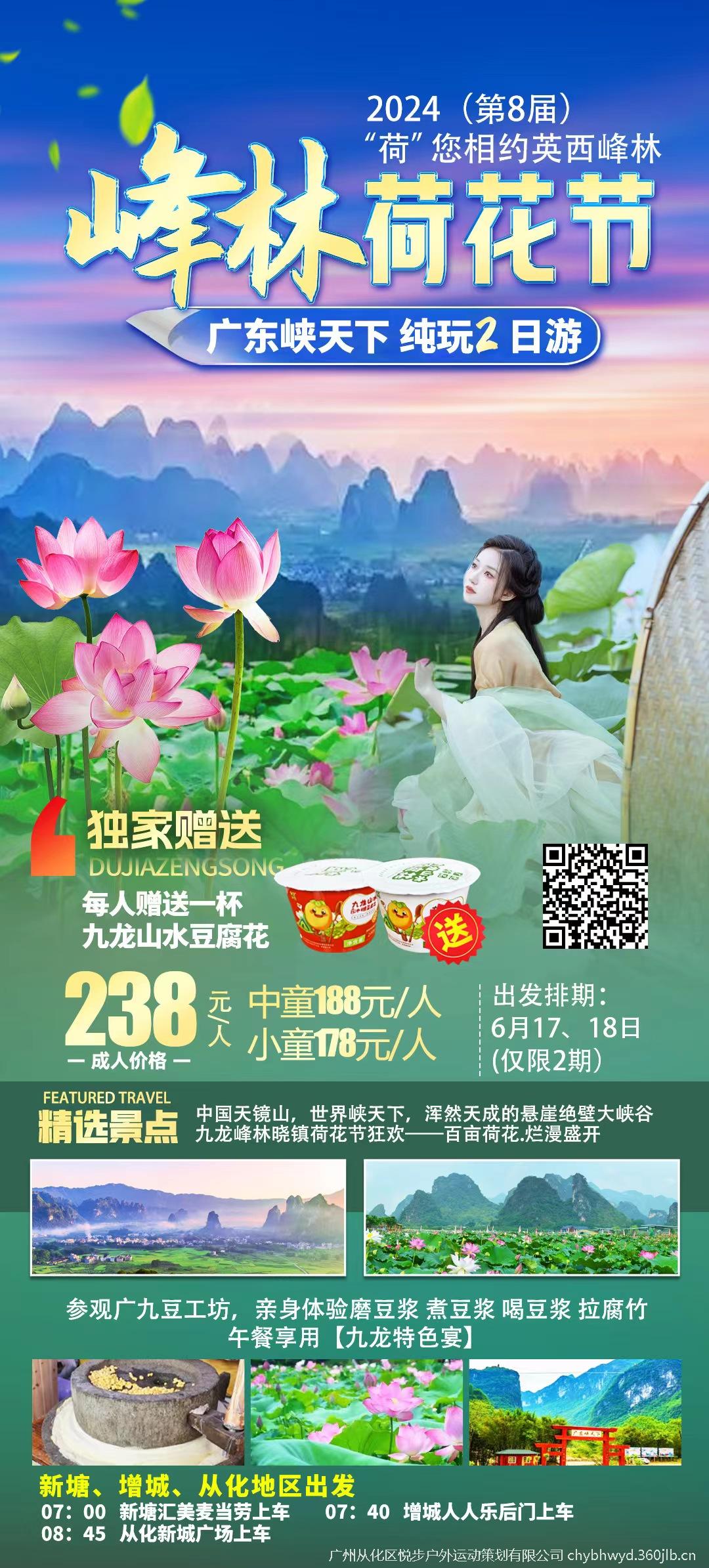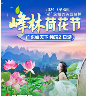 第一天:始发地—英西午餐【英西九龙特色宴】—英西峰林晓镇、荷花节—广九豆工坊—晚餐自理—入住阳山县城舒适型酒店