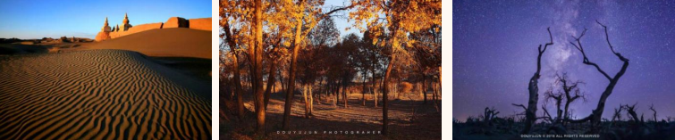 大漠胡杨林:世界上最古老的杨树品种,生命力极强,有“生而不死一千年,死而不倒一千年,倒而不朽一千年”的三千年生命之说.电影《英雄》张曼玉和章子怡决战的拍摄地