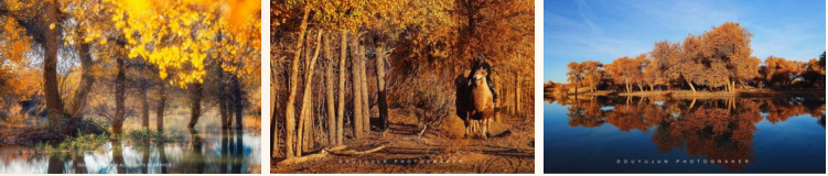 【水境胡杨】是最为经典的水境胡杨游览区,2.8公里水系沿岸的胡杨像是情窦初开的少女,站在河边轻抚面颊,娇艳欲滴的妆容,让人心生怜爱。湛蓝的天空、金色的胡杨、静仪的河水、木结构的廊桥,所有的一切都是恰到好处,随手一拍处处都是美景。胡杨的灵与河水的动相结合,更是为这里增添了无限的灵气!