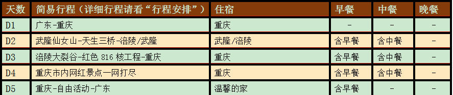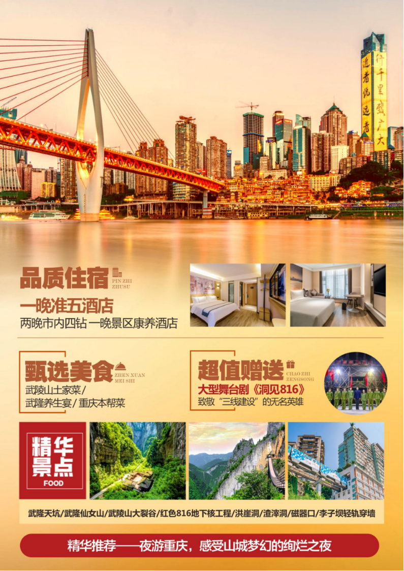 交通:广东-重庆往返动车二等座/机票经济舱,团队机票不退不改!
