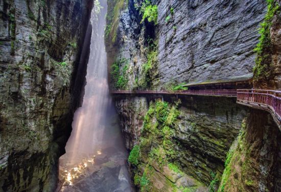 ●早餐后,游览有着”中国第一动感峡谷”美誉的【武陵山大裂谷】(游览时间约2.5小时,已含景区门票),景区核心区为一条长约10公里的喀斯特地貌原生态裂谷。整个裂谷雄阔壮美、气势磅礴,两岸层峦叠嶂、峭壁如削,瀑布直挂绝岭、飞泻而下,河谷迂回婉转、幽深迷离,谷底奇石叠垒、溪流淙淙。景区集山、峡、林、泉、瀑、崖、洞、潭、溪、坑、缝于一体,特别是其状如薄刀、连绵上千米的绝壁石峰国内罕见,一段长约1500米的裂谷地缝冠绝天下。在绿荫葱茏的主游道上,分布着一处处奇观异景:刀削斧劈,薄如纸翼的五座石峰,突兀而起,名之薄刀岭;绝壁相对,仅数尺狭缝,栈道嵌壁,碧潭盈底,称之石夹门;壁立千仞,岩面细缝排列,状似卷册,字之万卷书;百尺巨石斜插峭壁之间,形若盔甲猛士,号之将军头;还有如来神掌、铜墙铁壁、孔雀开屏、五猴下山、雌雄巨猩、一柱擎天、鳄鱼出水、巴将军、老君崖、水晶湖、灯杆石、情人谷、舍身崖、一线天、万丈坑等。一路行来,别有洞天,移步换景,数不胜数,目不暇接,美不胜收。