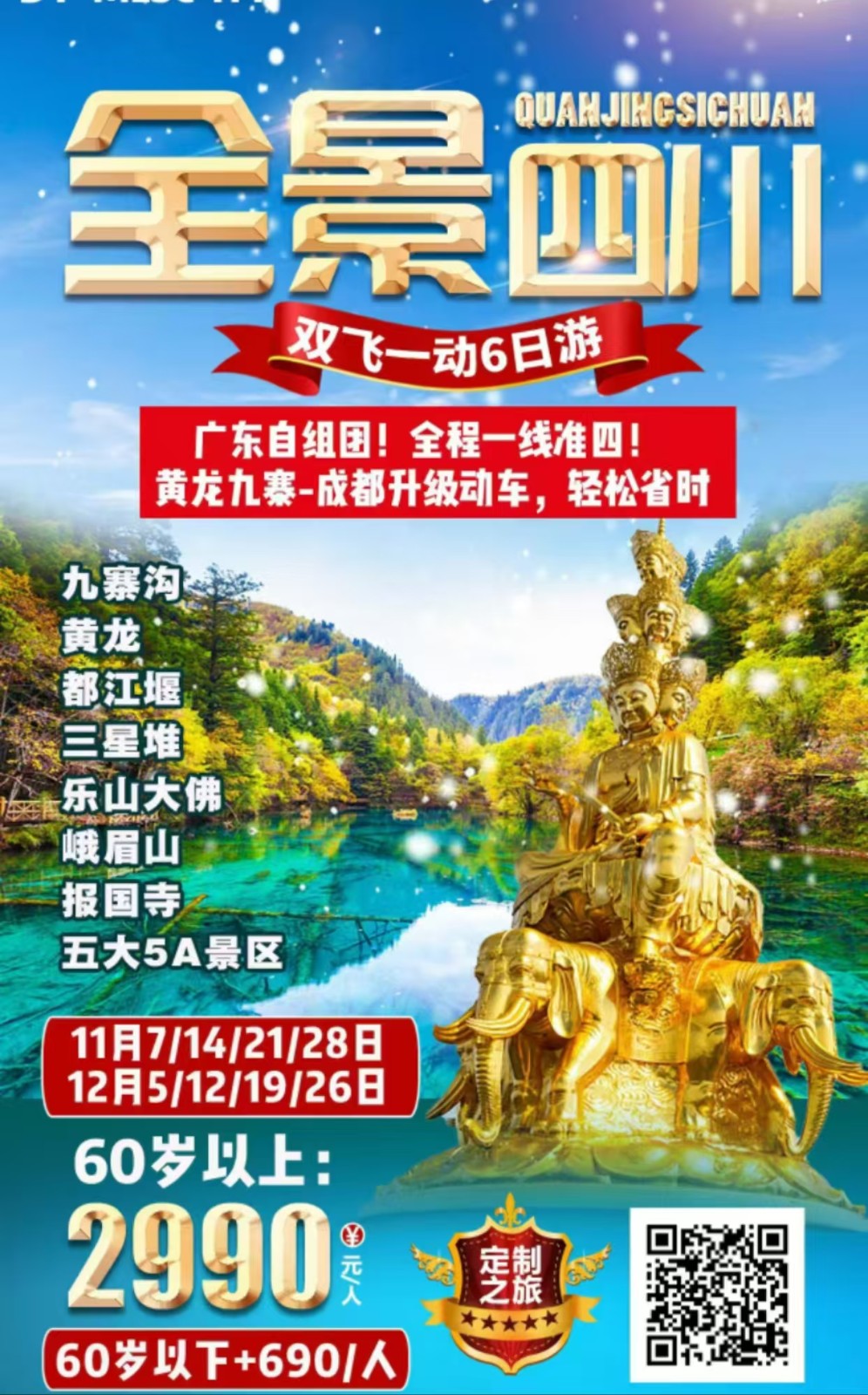 ★ 产品亮点:直飞成都,双飞一动,汽车进九寨,动车返回,全面领略沿途风光 ★ 舒适住宿:当地精选准四酒店(未挂牌),升级一晚国际品牌酒店智选假日系列 ★ 王牌景点:仙境九寨沟、人间瑶池黄龙、峨眉山金顶、乐山大佛、都江堰、三星堆 ★ 舌尖美食:峨眉跷脚牛肉、尓玛羌家宴、牦牛滋补汤锅,让你的味蕾一起旅行 ★ 休闲享受:自由体验休闲之都成都的慢生活和麻辣美食 ★ 尊享纯玩:广东成成团,舒适畅玩