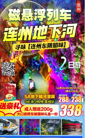 早餐—连州地下河(含游船)—午餐【连州腊味宴】—连南瑶族博物馆—返程