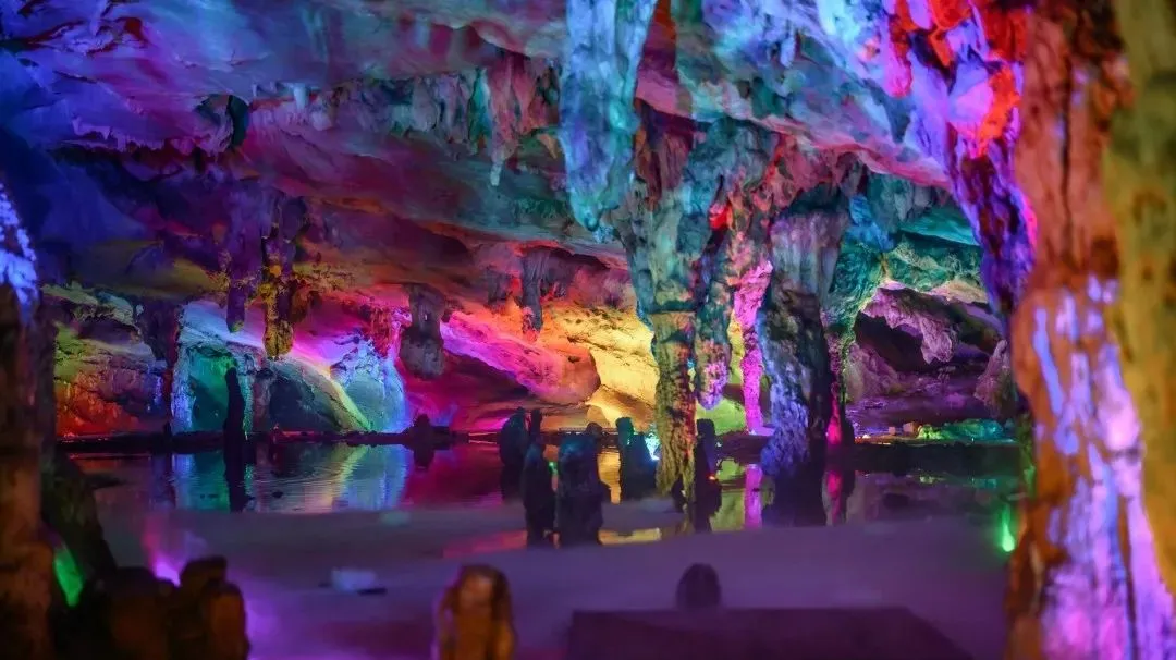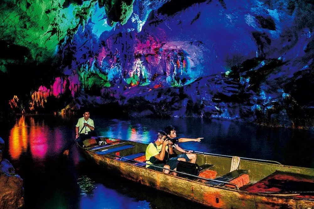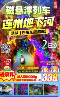 09:30-12:30游览【连州地下河】:游览神秘瑰丽的地下银河,这座巨型的天然石灰岩洞,因其岩洞口宽大而得名——大口岩,面积约45000平方米,共分三层,其中地下河全长约1500米,是目前全国最长、所发现最有价值的