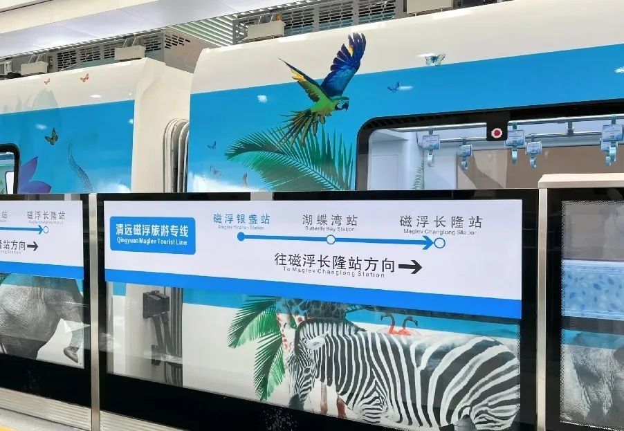 磁浮列车在陆地上(相对于地铁)运行,乘客有较好的视觉体验、在开阔空间行驶没有地下行驶的封闭感,直观安全感好,能给乘客带来良好的视觉感受。为充分契合旅游主题,列车的外观与内饰均经过精心设计,融入了丹顶鹤、长颈鹿、非洲象、大熊猫等多种活泼可爱的动物元素,以及充满童趣的动物脚印图案,为乘客营造了一个既温馨又富有乐趣的旅行环境。