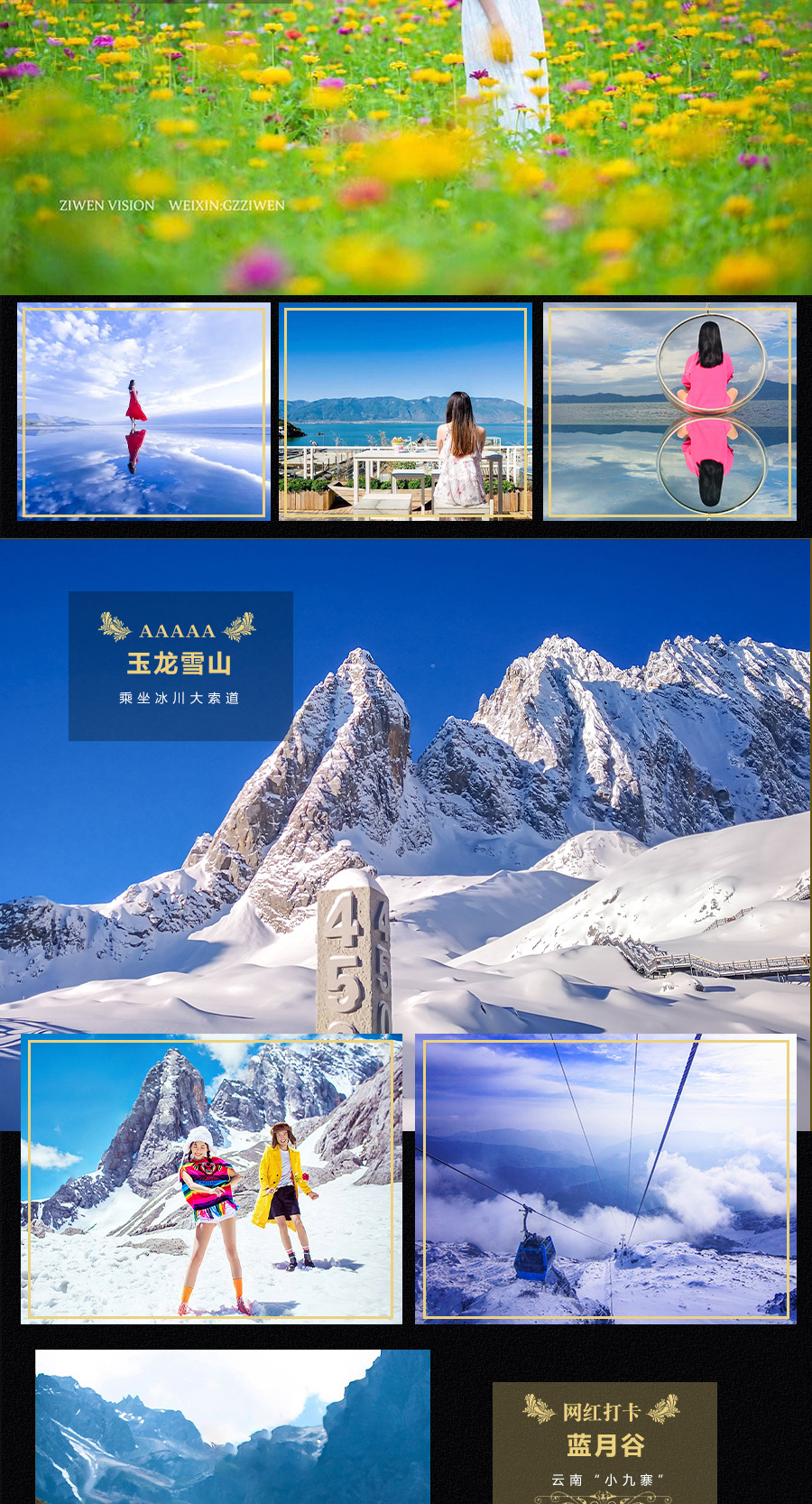 6、 景点(南诏风情岛、拉市海、虎跳峡、花语牧场、玉龙雪山门票、玉龙雪山云杉萍索道),大理古城及丽江古城不用门票
