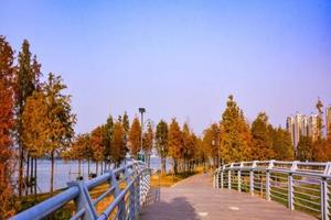 餐后前往【北江南岸公园】位于清远市清城区北江南岸、北江一路以北的带状区域,西起丁香花园酒店,东至五一码头,岸线总长约8公里,建设用地总面积约为81.1万平方米,是清远市积极推进全省建设“万里碧道”工作的重点工程,总投资约5亿元。主要建设内容包括:场地平整、土方工程、道路工程、给排水工程、停车场工程、园路与广场工程、园林小品工程、绿化工程、配套用房建筑工程、室外体育活动场地工程、以及配套设施工程等。项目将以以生态为底基,文化为先导,新建约8公里的沿江绿道,同时综合考虑周边市民群众的生活需求,将公园打造成为集市民健身,文化展示,休闲游乐,绿色低碳的城市新名片。一到冬日可见湖边的一排排水杉,就会有不少市民和游客打卡拍照,湖面波光粼粼倒映着一片水杉红美得让人不忍离开!