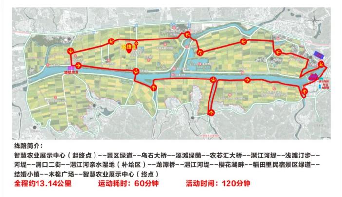 智慧农业展示中心(起终点)--景区绿道--乌石大桥--溪滩绿茵--农芯汇大桥--潖江河堤--浅滩汀步--河堤--洞口二街--潖江河亲水湿地(补给区)--龙潭桥--潖江河堤--樱花湖畔--稻田里民宿--景区绿道 --木棉广场--智慧农业展示中心(终点)