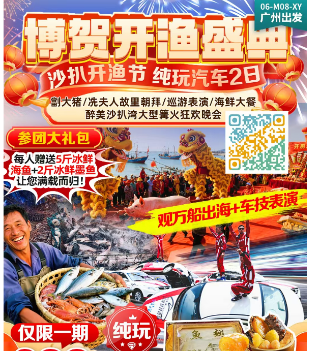 汽车 | 早餐后乘车前往【广东最大博贺渔港】作为广东海上丝绸之路的一个始发港,也被誉为“海上丝绸之路千年古 港”,这个名副其实的海鲜重镇,同时也是茂名的十佳最美渔港。濒临南海,呈狭长形,水陆交通便利,博贺 港口岸有码头岸线长 800 米,渡口五个,是天然避风良港之一。这个千年古港,白天千舟竞发,气势磅礴, 热闹非凡。而入夜,这里渔火万点,蔚为壮观。参加一年一度盛大的开渔节。有着“千年渔港”之称的博贺 渔港,每年这个时候都会举办博贺开渔节,也称南海博贺开渔节,这是茂名滨海新区博贺镇渔民们每年休渔期 结束后在博贺镇及博贺渔港码头举办的传统节日,更是当地所有渔民隆重庆祝的节日,节日庆祝包括举办开渔宴、祭海仪式、开船仪式、并在开渔仪式上表演的传统民族歌舞。开渔的号声一响,海港顿时沸腾了,千舟竞发,浪花飞溅。渔船首尾相接,宛如一支威风八面的庞大舰艇编队,劈波斩浪驶向大海远处,场面蔚为壮观。 至此,历经多月伏季休渔的海陵渔民,在鞭炮锣鼓声中迎来了开渔的好日子。2025博贺港开渔节当地空前重视,举办规模创历史新高,除往年特色节目外将新增民俗文化大巡游、美食嘉年华等丰富活动,让所有来宾尽兴而归!!! (特别说明:开渔节活动为政府行为,若遇上不可抗力因素/地方限制等原因导致 活动取消,本社不属违约!) 后前往享用《豪叹888元/围开渔豪宴》10-12人/桌 ⑤清蒸海鱼、⑥白切盐焗鸡、⑦卤水老鸭、⑧干煎墨鱼饼、⑨爆炒鱼丸、 【冼太故里】(重金含大门票),参加“冼夫人”巡游,一支支盛妆打扮的队伍,抬着当天劏的大猪举行祭海仪式 洗夫人故里是“好心”文化传承圣地,在1400多年前南越大地上有一位女性的楷模她历经梁、陈、隋三朝她始终致力于维护国家统一和民族团结为岭南的繁荣和稳定作出卓越贡献她将脱离中央政权600多年之久的海南岛, 她自爱、自强、自立被岭南民众尊称为“圣母”享万民祭祀她受七 朝君王封赐她集优秀女性传统美德于一身她是世界女性的楷模……她就是被周恩来总理誉为“中国巾帼英雄第一人” 是在整合冼太夫人文化和百越文化元素的基础上建设的国家AAAA级旅游景区,首批全国民族团结进步教育基地,广东省爱国主义教育基地。目前景区已完成岭南圣母文化广场(岭南圣母巨型雕像、岭南圣母牌坊、冼夫人文化宣传长廊、隋谯国夫人传碑记墙),神道,金水桥,见心亭,大观园舞台,冼冯圣贤殿、年例广场,景区内有娘娘庙(冼太夫人庙)等历史文物,其中冼府、冼墓、冼庙“三冼”并存的文物文化资源在全国绝无仅有。 | ||||||