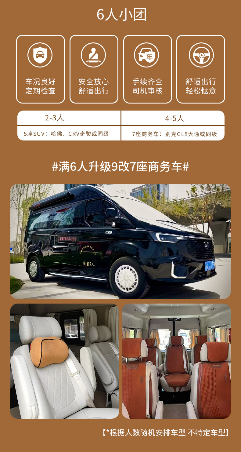 3、用车:2-3客人用5座SUV,4-5客人用7座商务车,6客人用9改7商务车(小团副驾驶及前后座位需要轮流乘坐,望悉知),含全程油费、过路费、驾驶员食宿;