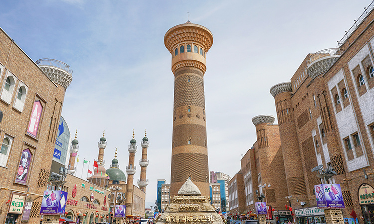 【国际大巴扎】——世界上规模最大的巴扎(巴扎为维吾尔语,意为集市)。具有浓郁的伊斯兰建筑风格,体现了浓郁的西域民族特色和地域文化,这里除了有令人眼花缭乱的商贸市场外,还有美食广场、观光清真寺、80米高的新疆第一观光塔等设施。