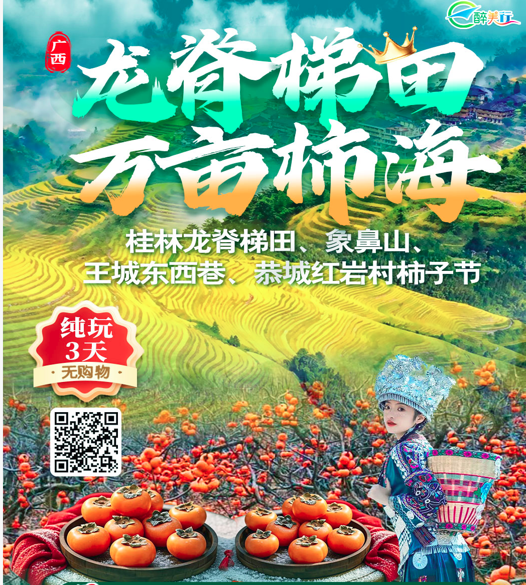 餐后:游览【红岩新村一柿子节 自由拍摄红火火像灯笼一样挂满枝头美景】(自由观赏约60分钟,不含换乘车费用10元人)一路可以欣赏到红红火火的柿子像灯笼一样挂满枝头,点缀漫山遍野,构成了一幅幅美丽的山水画。在这里,看月柿如海,闻山果飘香,过农家生活,享山野情趣,体验美丽的生态风光。一年一度的恭城月柿节,“金秋柿又红,宜居瑶乡梦”摄影;欢乐柿乡。