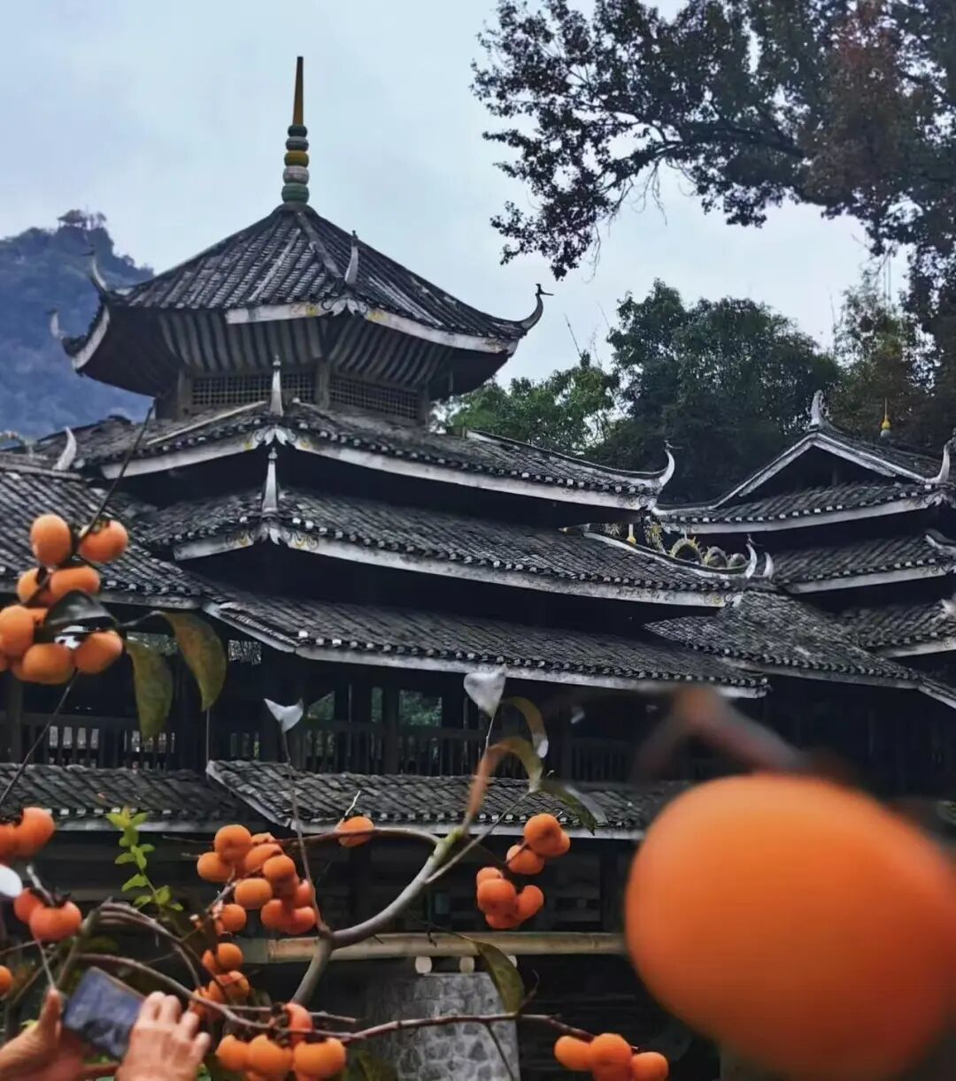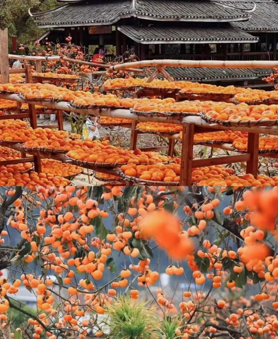那凝结枝头的果实,与乌瓦白墙相映成趣。在这里,秋意不止是丰收,也是炊烟袅袅的人间烟火,走在古村里,沿途红红火火的柿子像灯笼一样挂满枝头,点缀漫山遍野,点亮了整个秋天