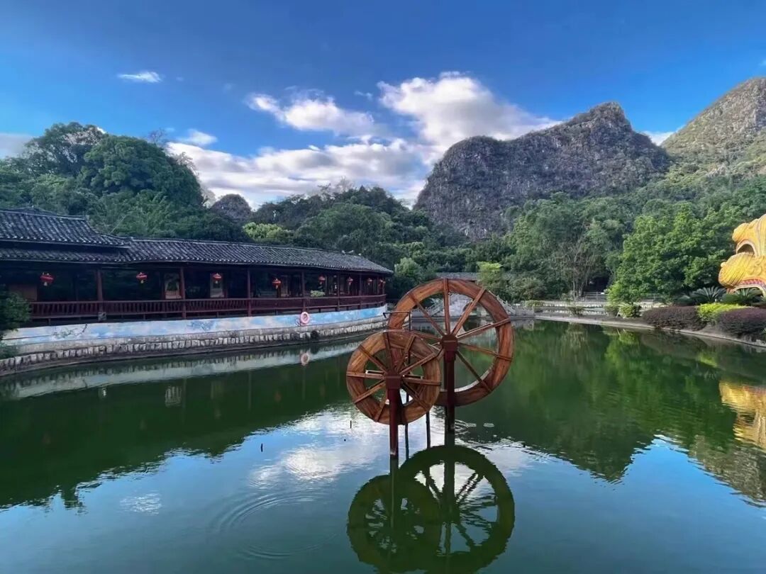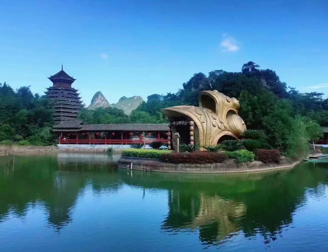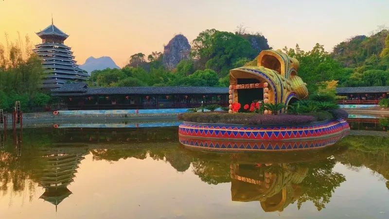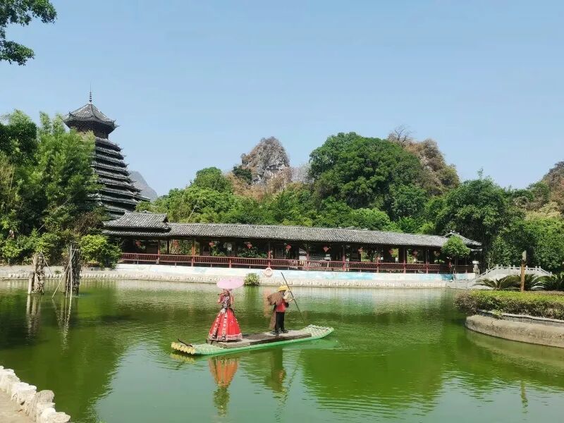 前往游览实景地—【刘三姐大观园】(自费套餐包含,游览约 90 分钟 ),园内有电影《刘三姐》主 要镜头画面的修复再现 ,游客们既能观赏刘三姐对歌台上楚楚动人的壮家少女的歌舞表演 ,还能亲自 体验广西壮、侗、苗、瑶的民俗风情生活情趣 ,壮观的大水幕 ,五彩缤纷的喷泉 ,让游客一饱眼福。