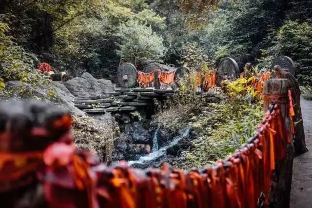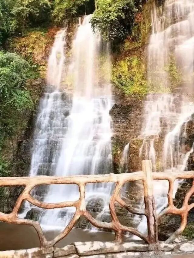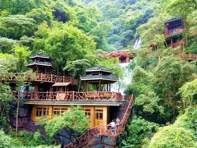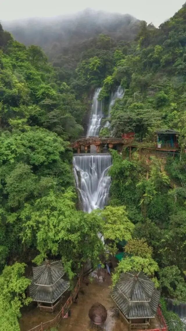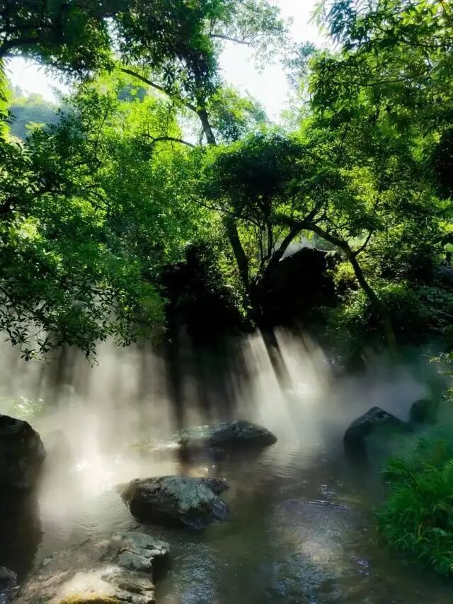 行走其间,曲径通幽,深吸一口气,仿佛将身体中的浊气洗净。仰头四望,阳光中从高处洒落的溪水,飞流直下,似云似雾……
