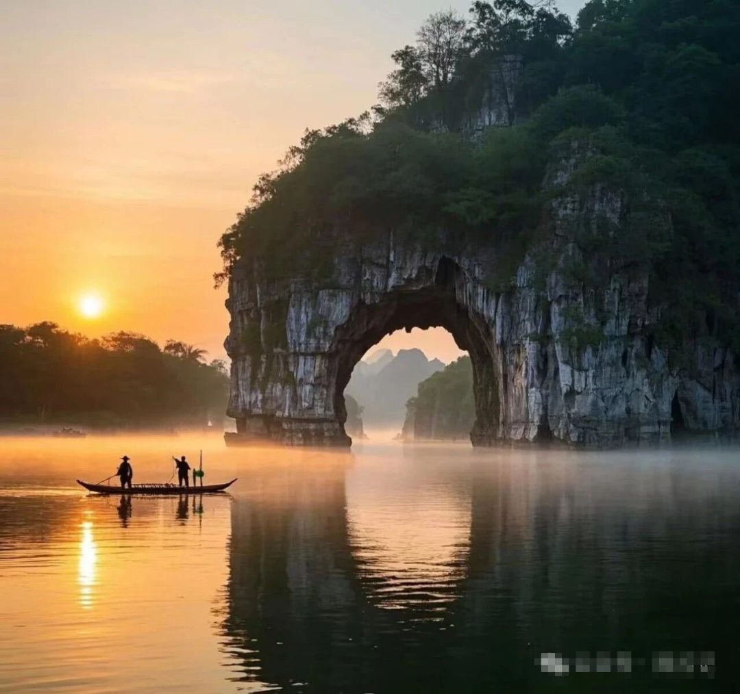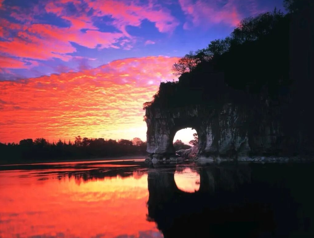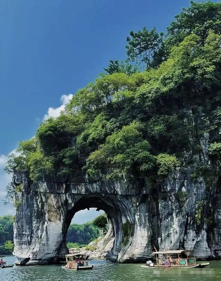 象鼻与象腿间,藏着通透圆洞“水月洞” 。约2亿年前,漓江河道变迁、江水冲刷溶蚀,造就这一奇观。明月之夜,洞中、江面、水底月影交融,“水底有明月,水上明月浮”,绘就“象山水月”绝景,为桂林十大景之一。