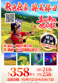 下午【连山·梯田】黑山梯田位于清远市连山壮族瑶族自治县太保镇黑山村,众多山峰犹如布阵列队,极富特色,众山包裹下的梯田,曲线优美。黑山梯田行摄之旅---黑山又称黑山脚,是黑山行政村的简称,因为以前未被开发的时候,“黑山”就是一大片原始森林,山上到处长满了参天大树,进到山里,就象黑夜一样,故名黑山。黑山梯田环绕在大雾山脚、白面峰下,面积较大的有黑山头梯田(岭儿寨)、新田头梯田(金鸡嘴)、山塘梯田、屋地冲梯田,共有面积1000亩。当地百姓一年耕种一季水稻,每年农历3月是当地村民的开耕,三月初三是当地人的开耕节,农历端午前后插田,这时节的梯田波光粼粼,婉如一幅幅水墨画;中秋至国庆时节,稻谷成熟,层层梯田稻浪翻滚。(此为属于季节性产品、以实际观赏为准,谢谢!)餐后前往卡连山网红村【壮瑶文化部落】广东省清远市连山壮族瑶族自治县永和镇石坪村,是一个具有数百年历史的壮瑶民族聚居村落。石坪村保留了丰富的壮瑶民族文化传统,村内建筑外墙绘有壮瑶民族特色壁画,色彩斑斓,生动展现了民族风情。此外,村里还保留了传统宗祠和民俗活动,如壮族的七月香壮家戏水节、瑶族的盘王节等。此外,村里还开发了梯田花海、共享菜园等特色项目,打造了集文化沉浸、休闲度假、篝火晚会等功能于一体的乡村旅游项目。如今的石坪村已成为远近闻名的“网红村”,吸引了大量游客前来体验壮瑶文化和乡村风情。这里远离城市喧嚣,这里有亲民食堂、手工乡村咖啡、热闹市集,有花海、书吧、餐饮、农耕体验、露营……在这里,你可以放空自己,可以洗涤心灵,可以沉淀思绪……
