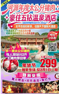 299元【河源】年度太公分猪肉:每人现场分土猪肉2斤带回家、 特别安排篝火晚会+欢乐追龙+鱼灯节、浸泡特有水晶温泉、 品杀猪宴+簸箕宴、太平古街扫年货、住客天下国际大酒店2天 | |