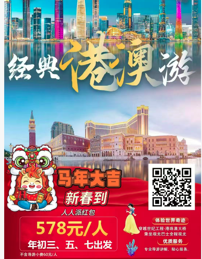 香港+港珠澳大桥+澳门+深中通道二日游团费537+60行程特色:双世纪工程快来感受港澳新年气氛吧![庆祝][庆祝][庆祝]【一次游遍港澳】+【港珠澳大桥】+【深中通道】[转圈]香港+澳门+珠海2天品质游(含二正一早)!!🚌2月19日(年初三)加开第2车,位置充足!🚌2月21日(年周五)已成团,位置充足!🚌2月23日(年初七)已上客,位置充足!深中通道:世界纪录等10余项世界之最工程港珠澳大桥:被誉为“世界第七...